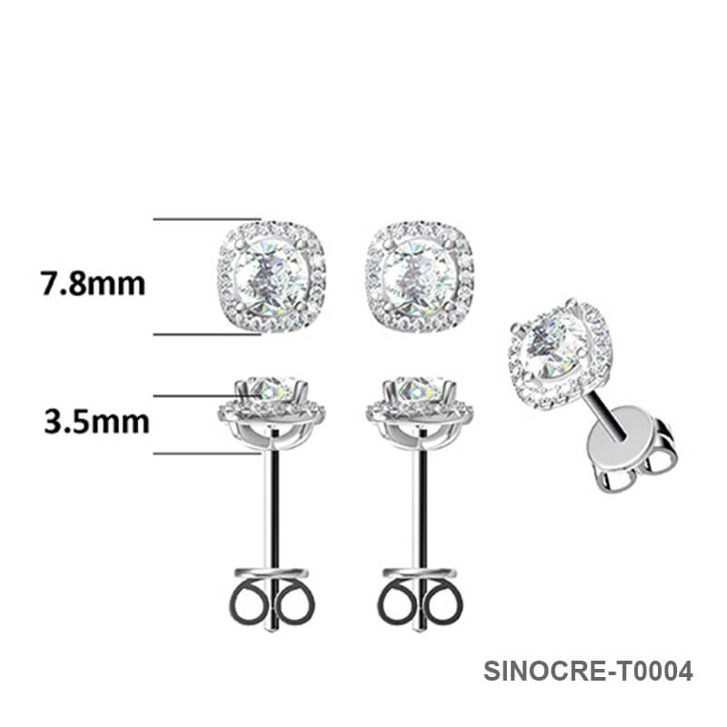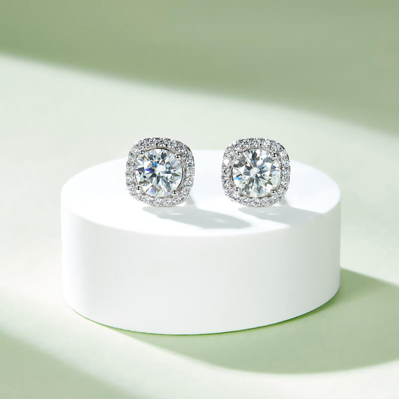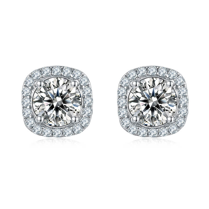 Classic Square Shape Round Moissanite Stud Earring with Tiny Diamond Around