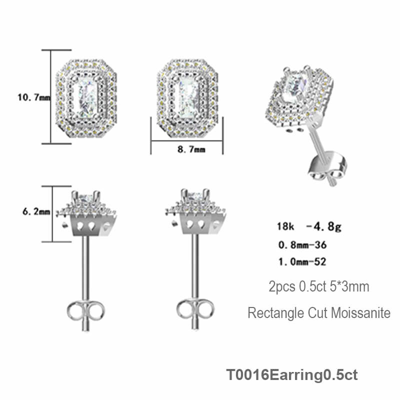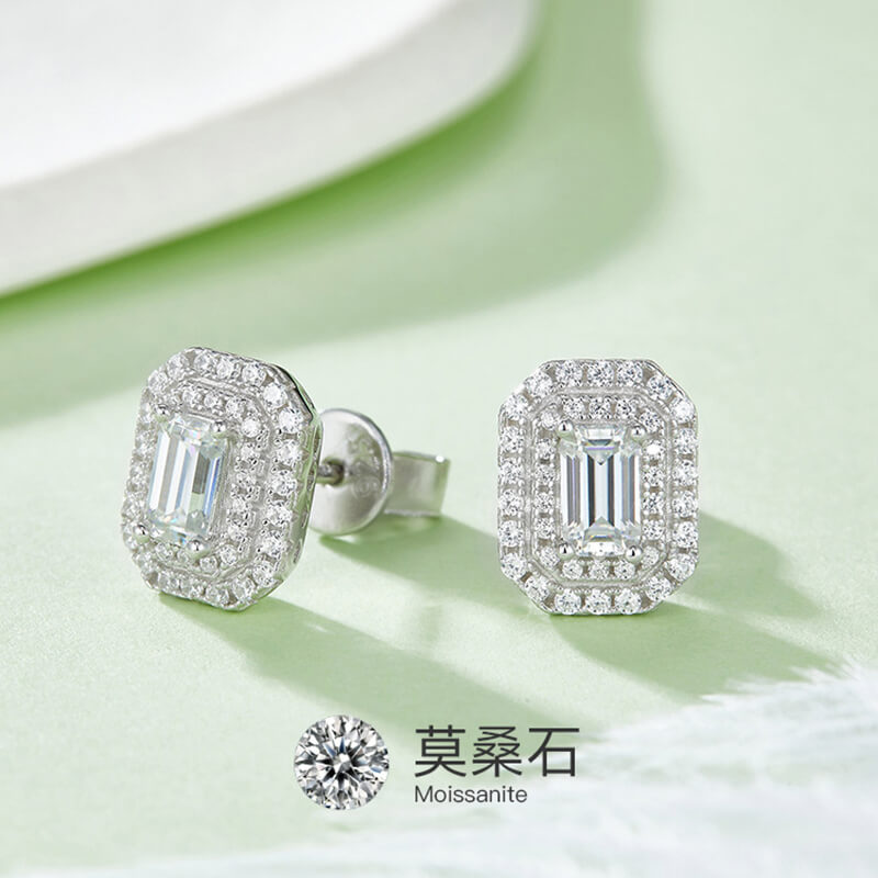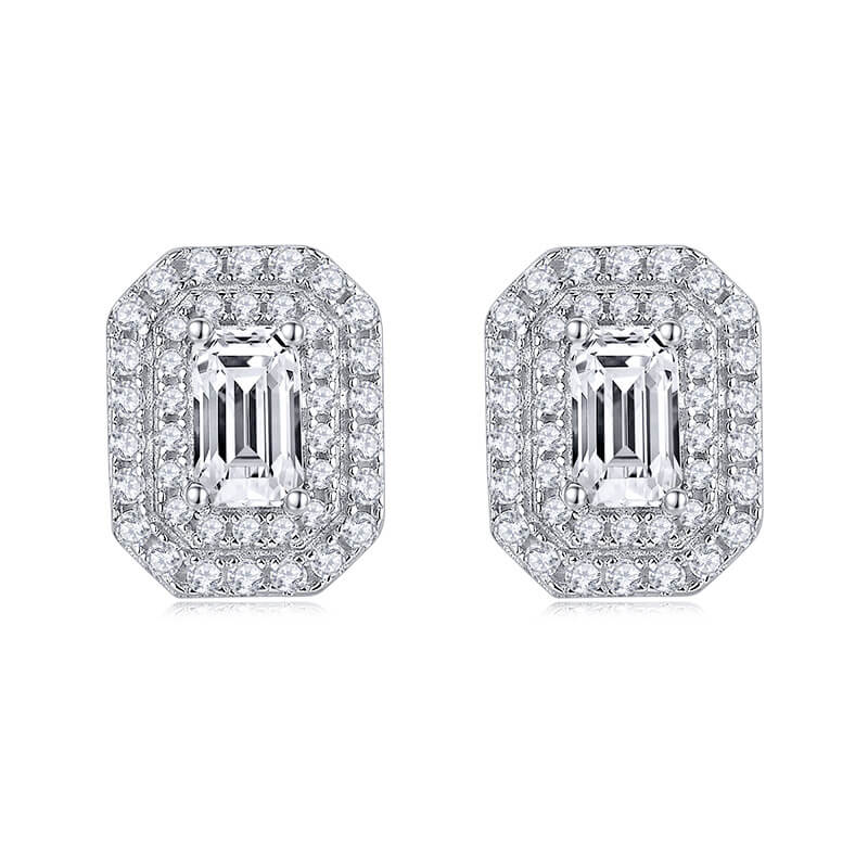 Luxury Rectangle Shape Emerald Cut Moissanite Stud Earring with 2layers Tiny Diamonds Around